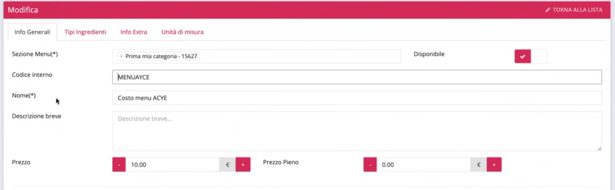 Per inserire e passare il costo a coperto per il menu All You Can Eat occorre creare un prodotto su SeeYouFood e, nel campo Codice interno inserire la voce MENUAYCE, impostando il costo nel relativo spazio Prezzo, come da screenshot.