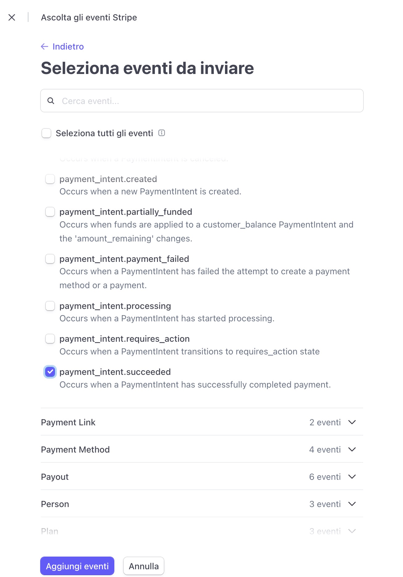 - Nella sezione "Seleziona eventi da ascoltare" aggiungi i due di seguito: