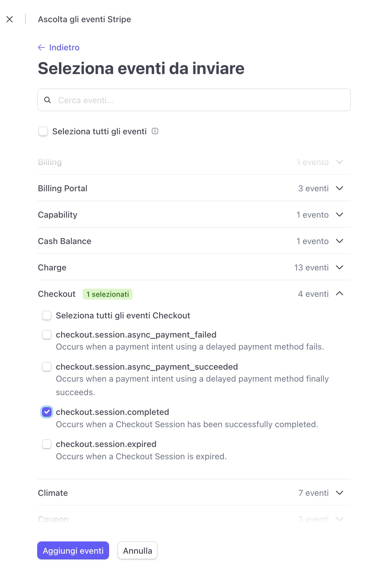 - Click su Aggiungi eventi e salva