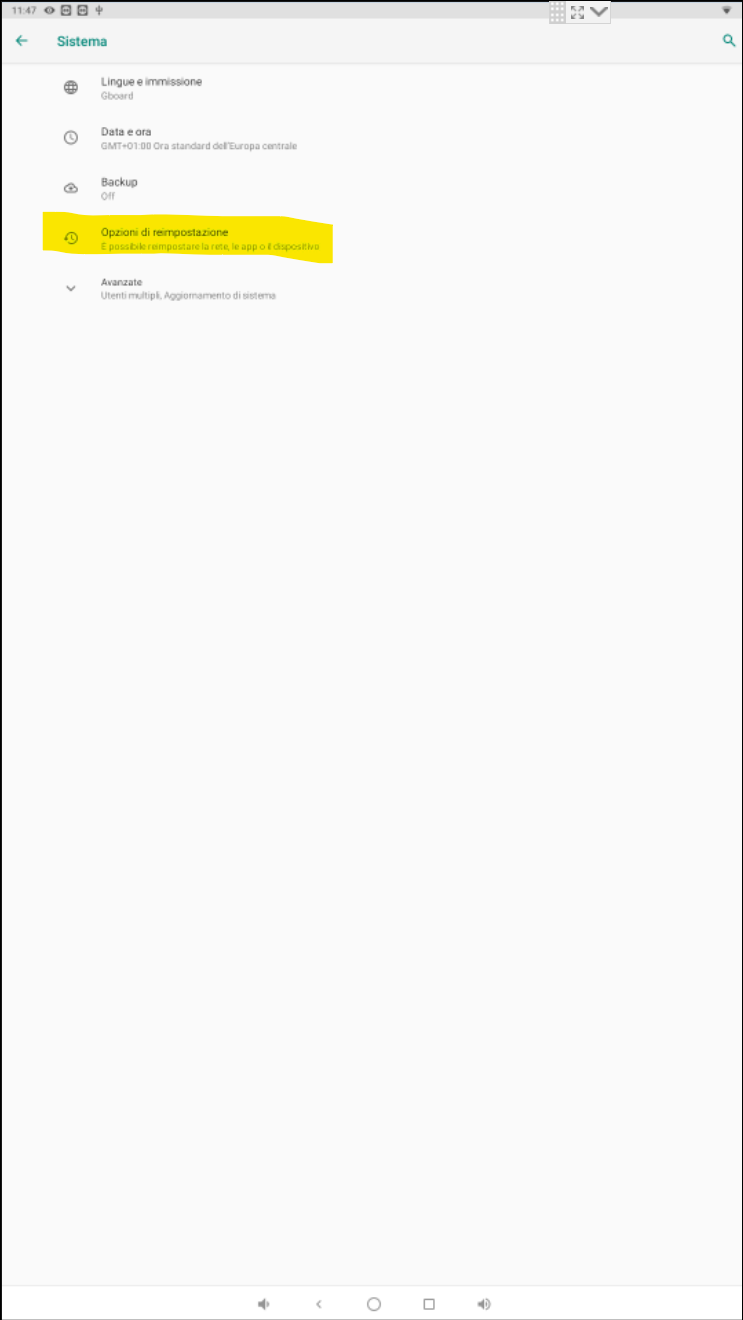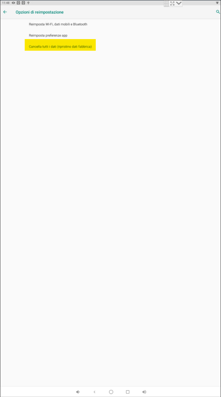 IMPORTANTE: il dispositivo verrà resettato totalmente, dati e app incluse. Al termine della procedura sarà quindi necessario la reinstallazione delle app e l’eventuale risincronizzazione degli account gmail, se attivati.