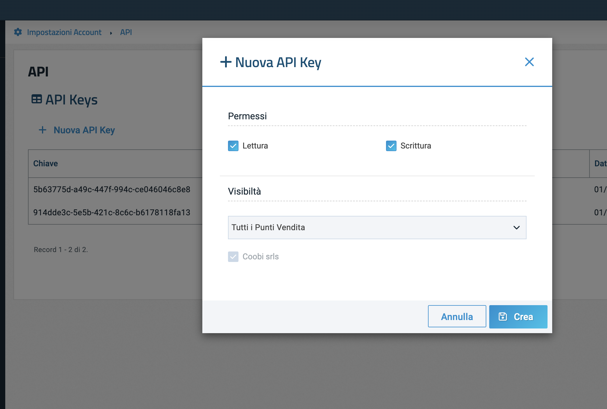 IMPORTANTE: In caso di più punti vendita va selezionato solo uno alla volta. Le Key, infatti, devono essere monolocale e, in presenza di locali diversi vanno create tutte separatamente.